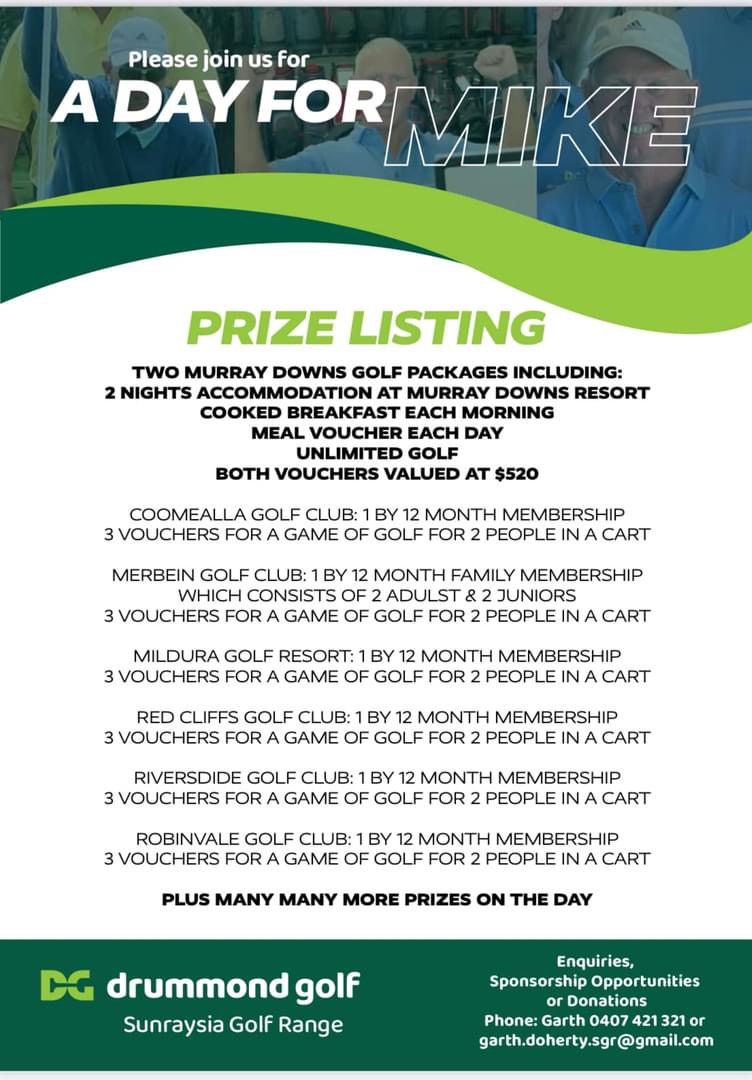Sunraysia Golf Range are organizing a 2 Person Ambrose at Riverside Golf Club, hitting off at 9:00am. Entry is $100 per person. All participants will recive a free Bacon & Egg breakfast & Barbecue lunch, 6 drink tickets on course & a "Day For Mike" stubby hololder. plus a 120 Ball Voucher to Drummond Golf Sunraysia Golf Range. Lots of prizes see here for details. Enter at Drummond Golf, Sunraysia Driving Range.