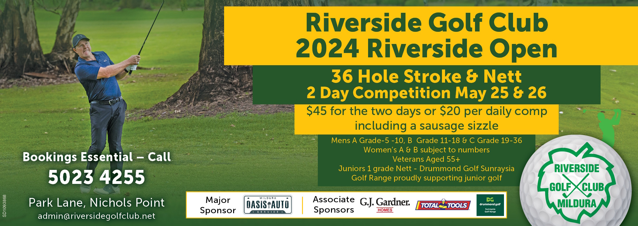 25th & 26th of May. Men's and Ladies 36 hole and daily 18 hole graded competition. Members can book through One Golf everyone else will need to contact the club on (03) 5023 4255. (Seeded groupings on Sunday). To be eligible for 36 hole prizes you must pay the entry fee of $45 on the Saturday, there is also a daily competition with a $20 entry fee. Mens competiitions will be A-Grade (10 maximum handicap), B Grade (11-18 handicap) and C Grade (19 minimum handicap). Womens grades will depend on the number of entries. There will also be a Veterans Competiton for 55+ ages and a Junior competition. Thanks to our major sponsor OASIS Auto and associate sponsors GJ Gardner Homes & Total Tools.