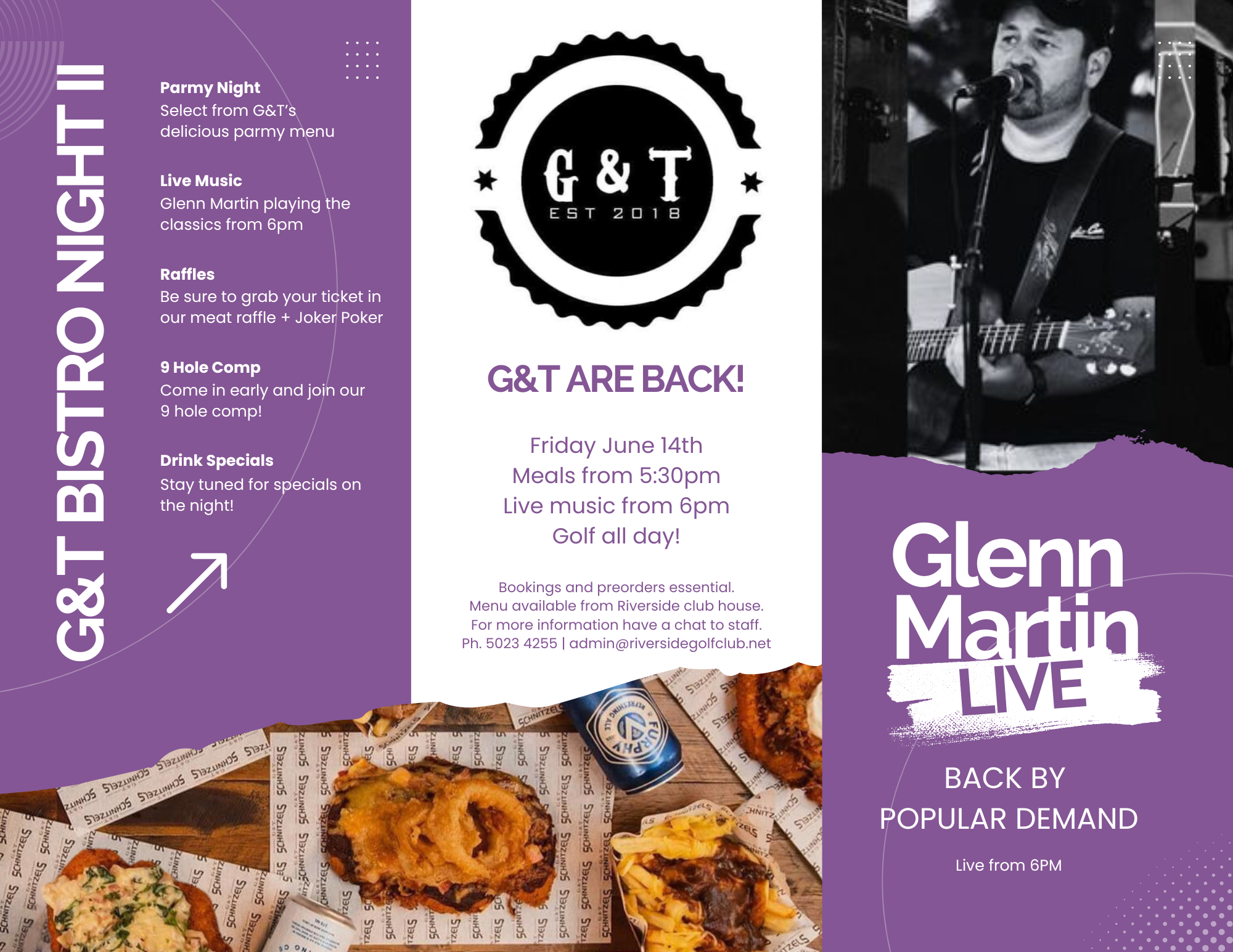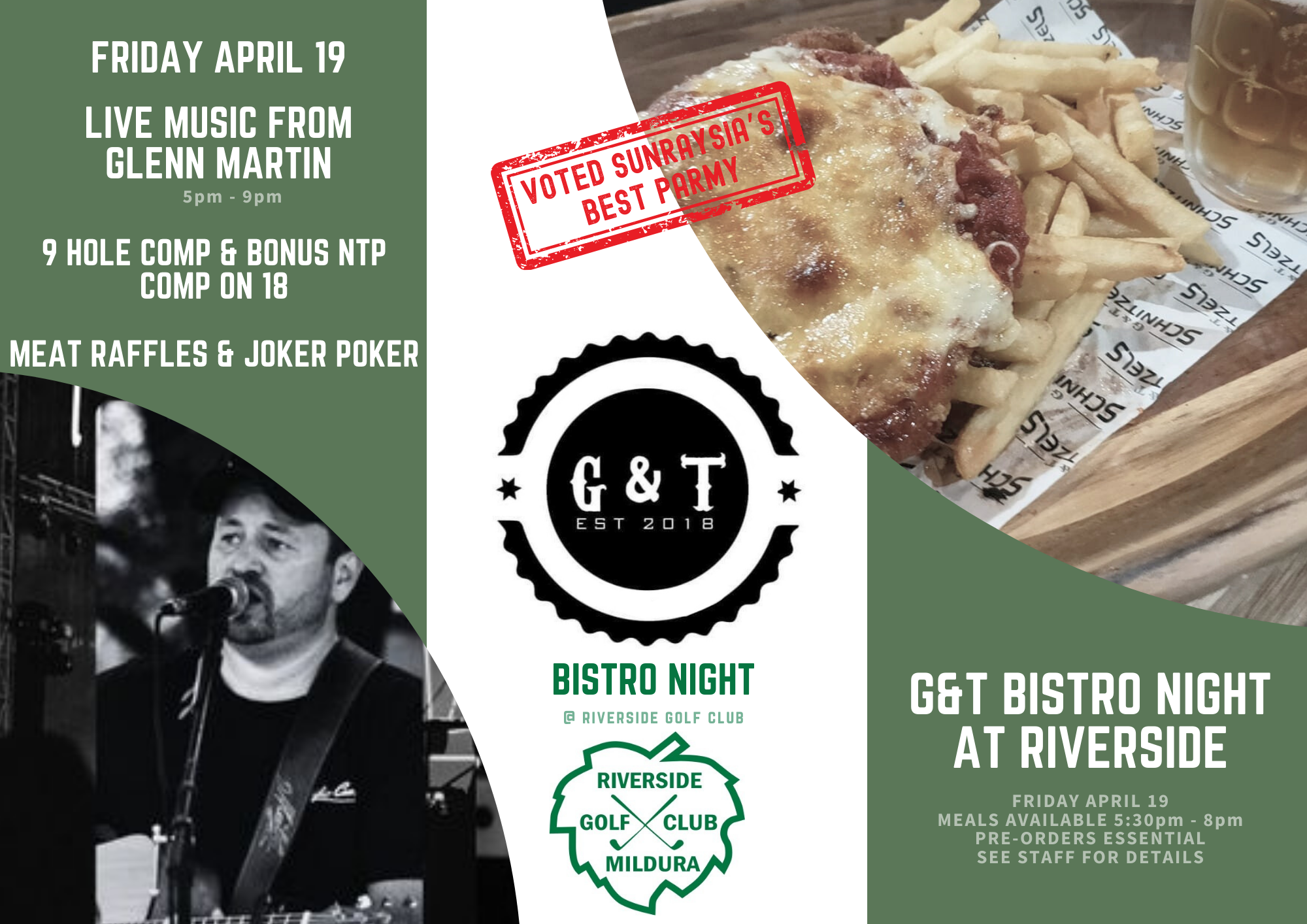 Meals available from 5:30pm. Pre-Orders essential - Menu Contact us on (03) 5023 4255. Live music from Glenn Martin from 6pm. 9 Hole comp. Drink Specials. Meat raffles & Joker Poker. Details.